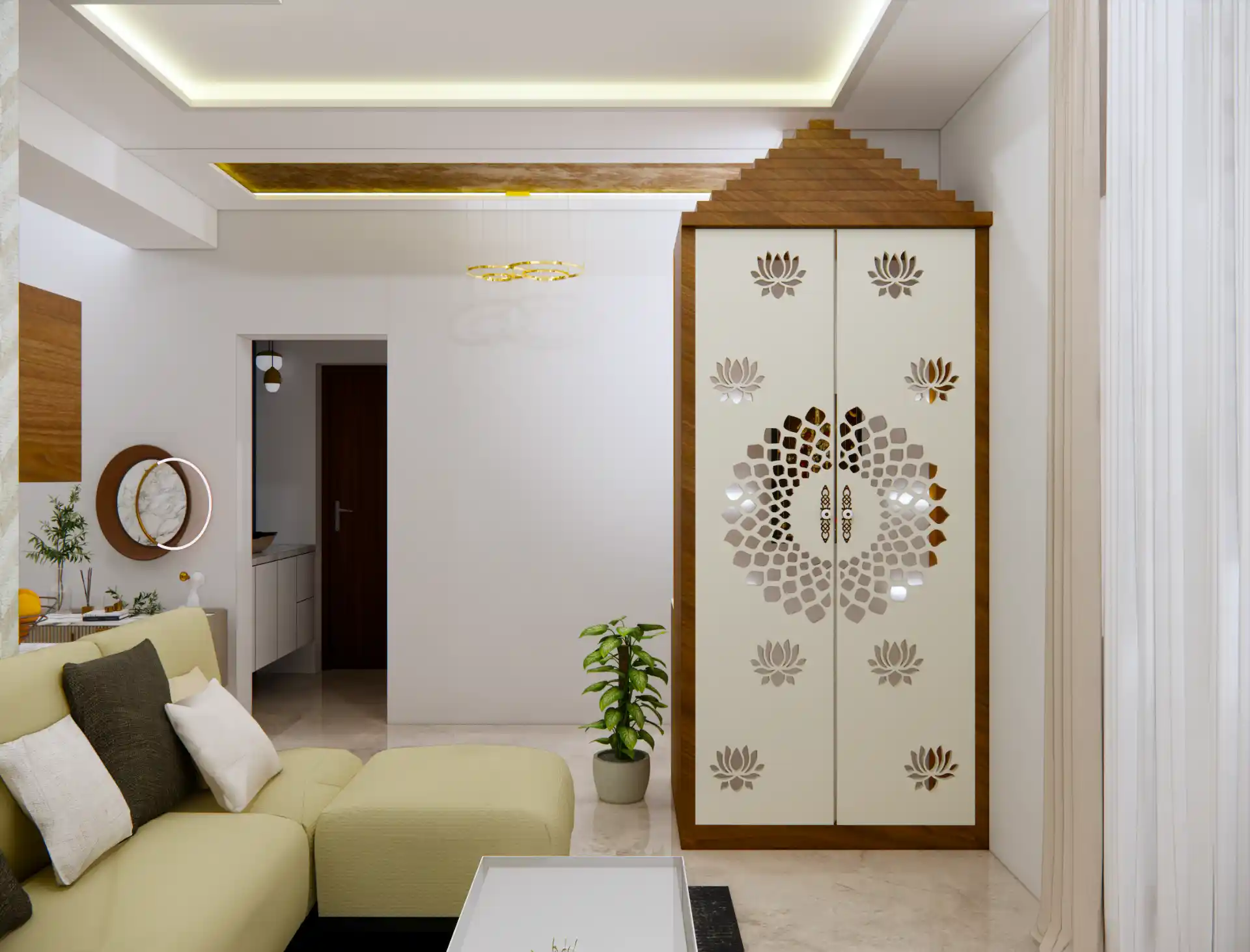 Serene pooja unit with jaali doors, warm wood, and lighting—ideal for compact, modern homes.