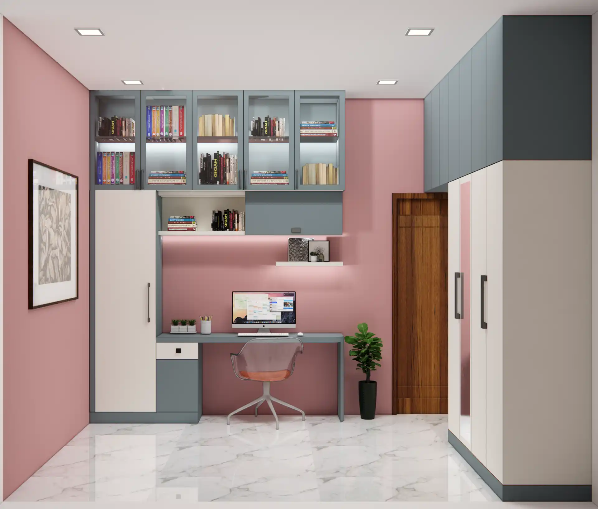 Productive study room with custom shelves, ergonomic desk, and minimalist decor